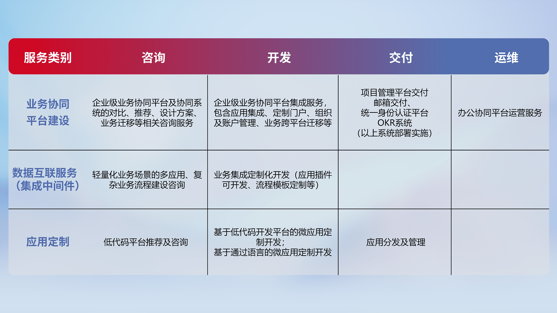 针对钉钉、、、企微、、IDaas等平台级产品提供产品的规划、、方案、、、交付、、定制化开发等服务,,,实现如统一协同办公、、、智能客户服务、、混合会议管理、、、智能数据查询、、等业务场景,,,,实现数字化转型。。